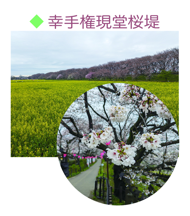 埼玉県幸手市にある関東屈指の桜の名所です。約1,000本のソメイヨシノが咲き誇り、桜の薄ピンクと周辺の菜の花の黄色が織りなす見事なコントラストが特徴です。これからの季節は桜まつりが開催され、ライトアップも実施されます。