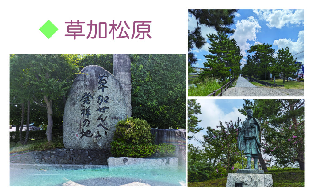 草加松原は、旧日光街道の綾瀬川沿いに広がる1.5キロメートルの松並木です。松尾芭蕉も通った松並木を歩くと江戸時代にタイムスリップしたような気持ちになります。