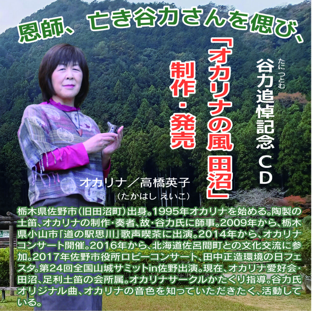 何年前なのか、歌手、小泉今日子さんがスマイルアゲインという曲をオカリナを吹きながら歌ってたのを高橋さんの演奏を聴きながら、ふと思い出した。佐野市在住のオカリナ奏者、高橋英子さんは、このほど、恩師でもある、亡き谷力さんを偲び、谷力追悼記念 「オカリナの風 田沼」を発表した。